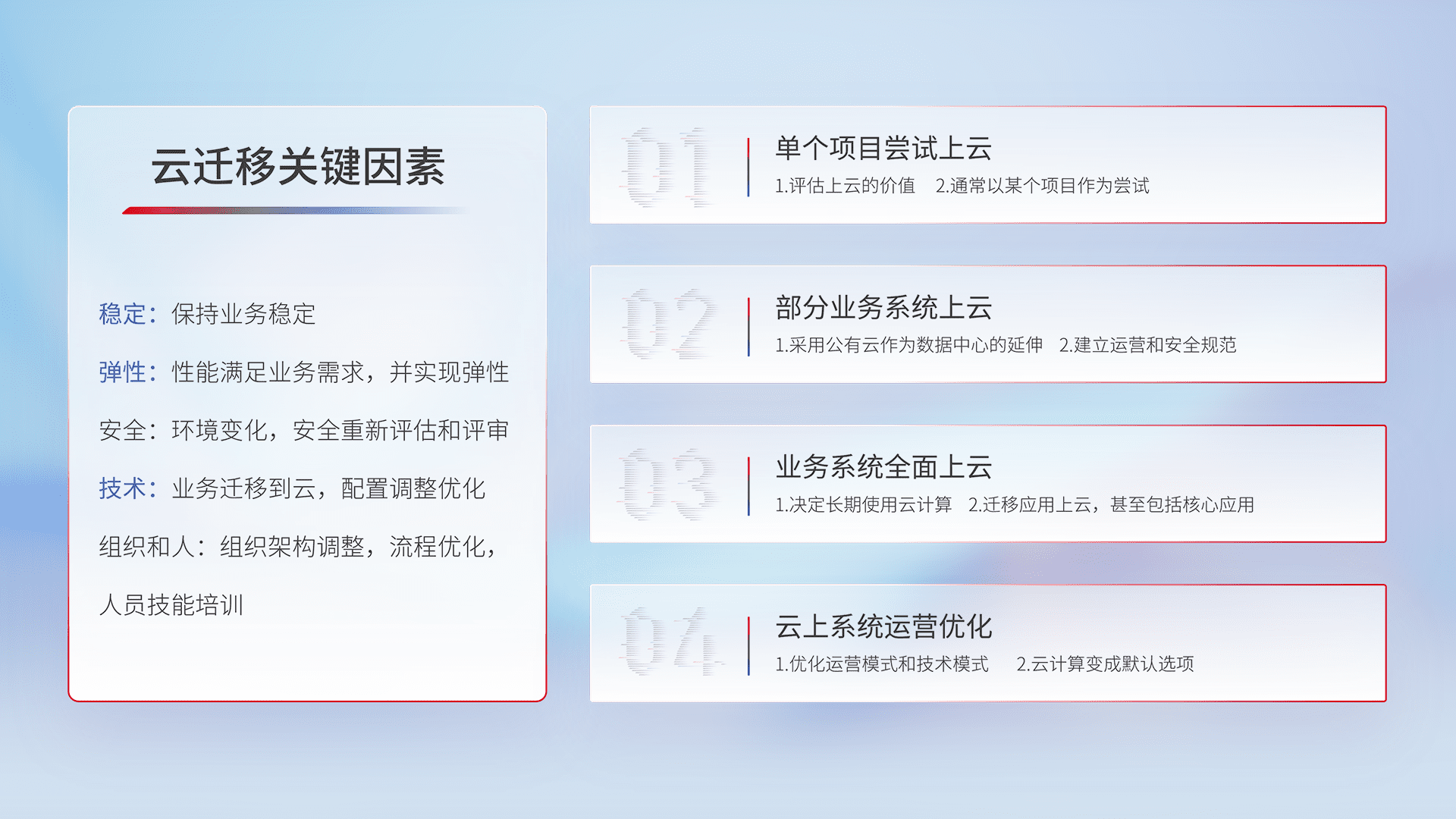 结合实际业务,,,,从规划设计、、云平台选型、、、云原生改造、、数据迁移、、、、集成交付,,迁移全过程为客户识别最佳上云路径,,做好风险识别管理,,,设计网络架构、、、身份权限、、安全审计合规、、、操作审计、、日志审计、、监控告警策略、、、、多站点容灾设计等,,,,对云上基础设施进行整体规划,,提升IT治理水平,,以满足弹性、、高可用、、、高性能的需求。。。。