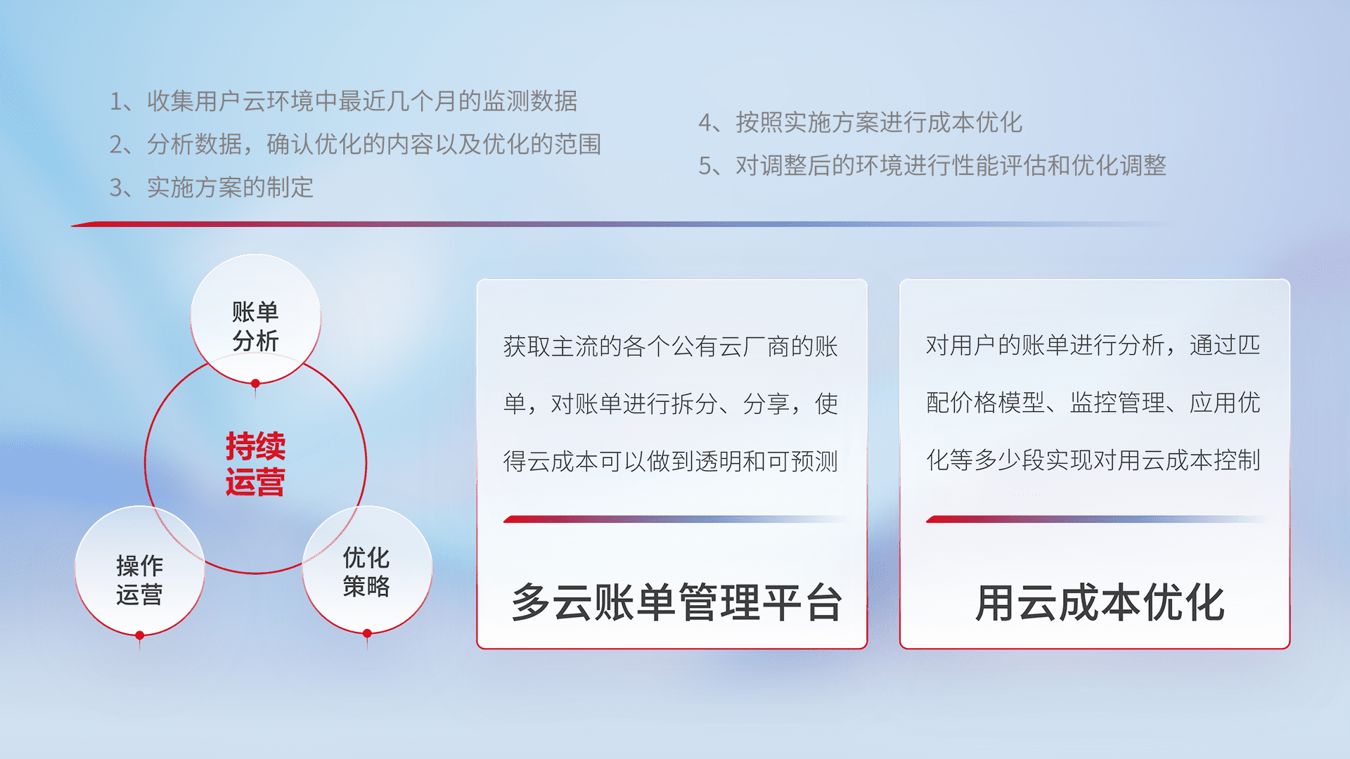 通过多云纳管,,以统一的资源数据模型把客户的云资源进行抽象和封装,,,进而实现对多云资源的统一操作,,保障云资源管理的可靠性、、、稳定性与可用性。。。。量身定制化运维内容,,,,配置、、开发运维、、补丁管理、、、、备份、、、监控、、、、认证和访问管理、、、审计和日常巡检等,,,保障在用云过程中的可靠度,,,稳定度以及高可用率。。。。
