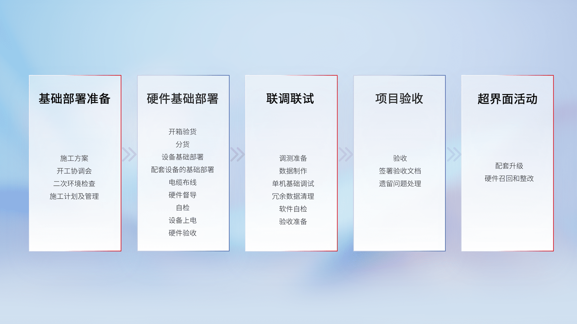 从基础部署准备、、、、硬件基础部署、、、联调联试、、、项目验收、、越界面活动的全过程可追溯,,,,保证施工质量和进度。。。。